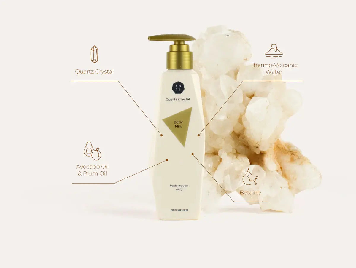 Die Anas Quartz Crystal Body Milk 250 ml ist deine tägliche Dosis luxuriöser Hydratation mit einer einzigartigen Crystal Touch. Diese nährende Bodymilk ist mit einem echten Quartz Crystal, botanischen Ölen und mineralreichem Thermo Volkanischem Wasser angereichert, um deine Haut intensiv zu pflegen und ihr einen wunderschönen Glow zu verleihen.