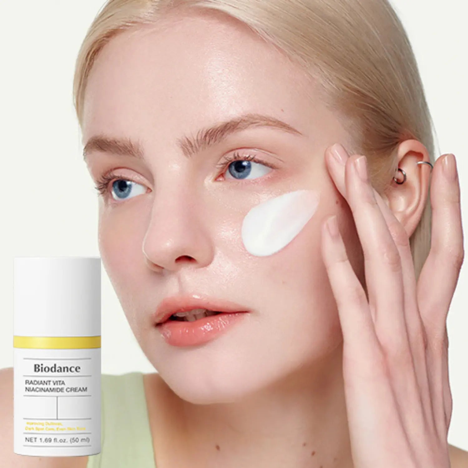 Die Biodance Radiant Vita Niacinamide Cream ist dein neuer Skincare-Held, wenn du von einem ebenmäßigen, strahlenden und gesunden Hautbild träumst. Diese All-in-One-Creme bekämpft gleich mehrere Hautprobleme auf einmal: von fahlem Teint über dunkle Flecken, unebene Hautstruktur bis hin zu Trockenheit. Dank der kraftvollen Multi Vita Mix und Niacinamide verleiht dir diese Creme einen strahlenden Glow: ganz ohne Trockenheitsgefühl.