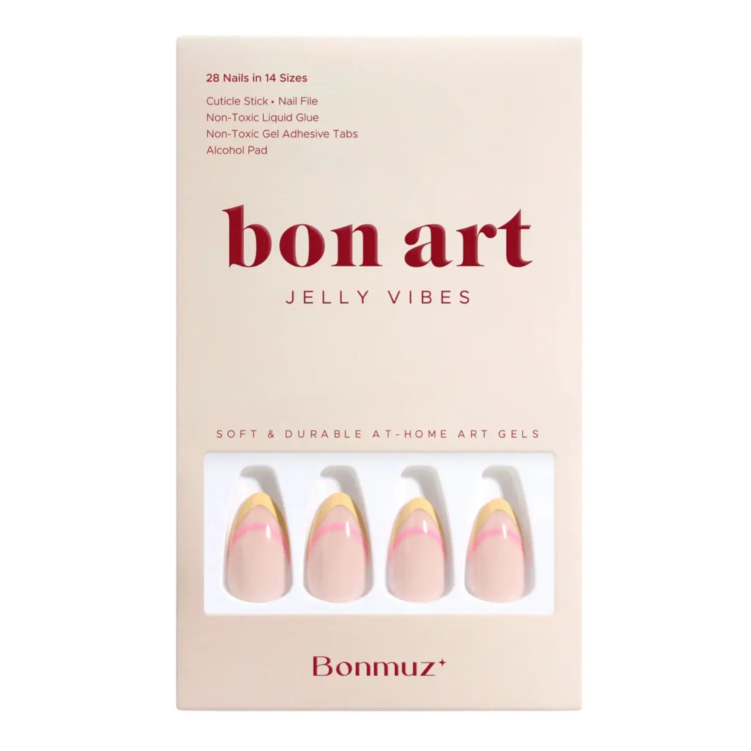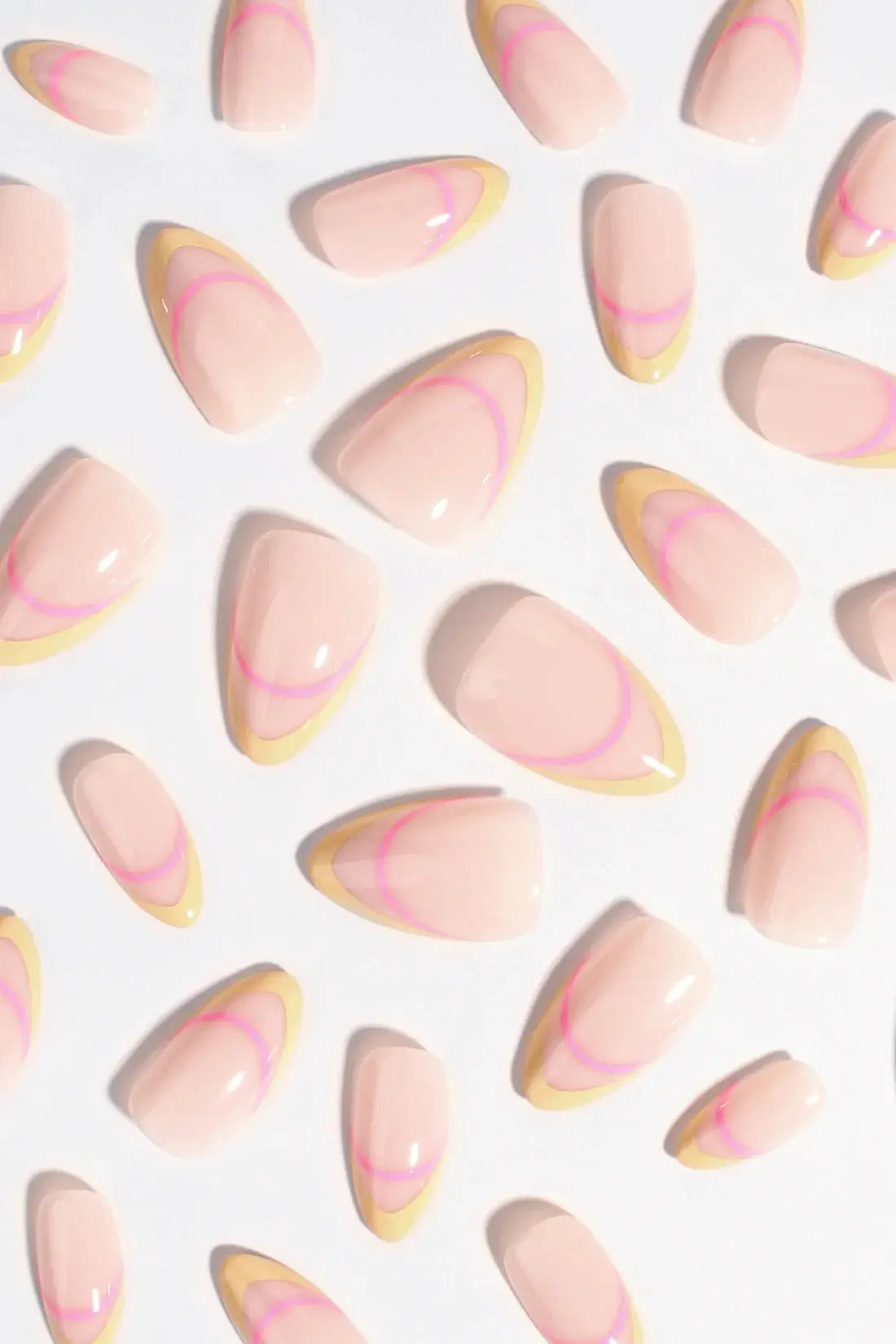 Die Bonmuz Press-On Nails Tango Twist sind eine energiegeladene Mischung aus vibrant pink und electrifying yellow, die sofort eine verspielte, auffällige Vibe verleiht. Die dünne Linie entlang des Randes sorgt für ein subtiles, raffiniertes Detail, das dem Design das gewisse Extra an Finesse gibt.