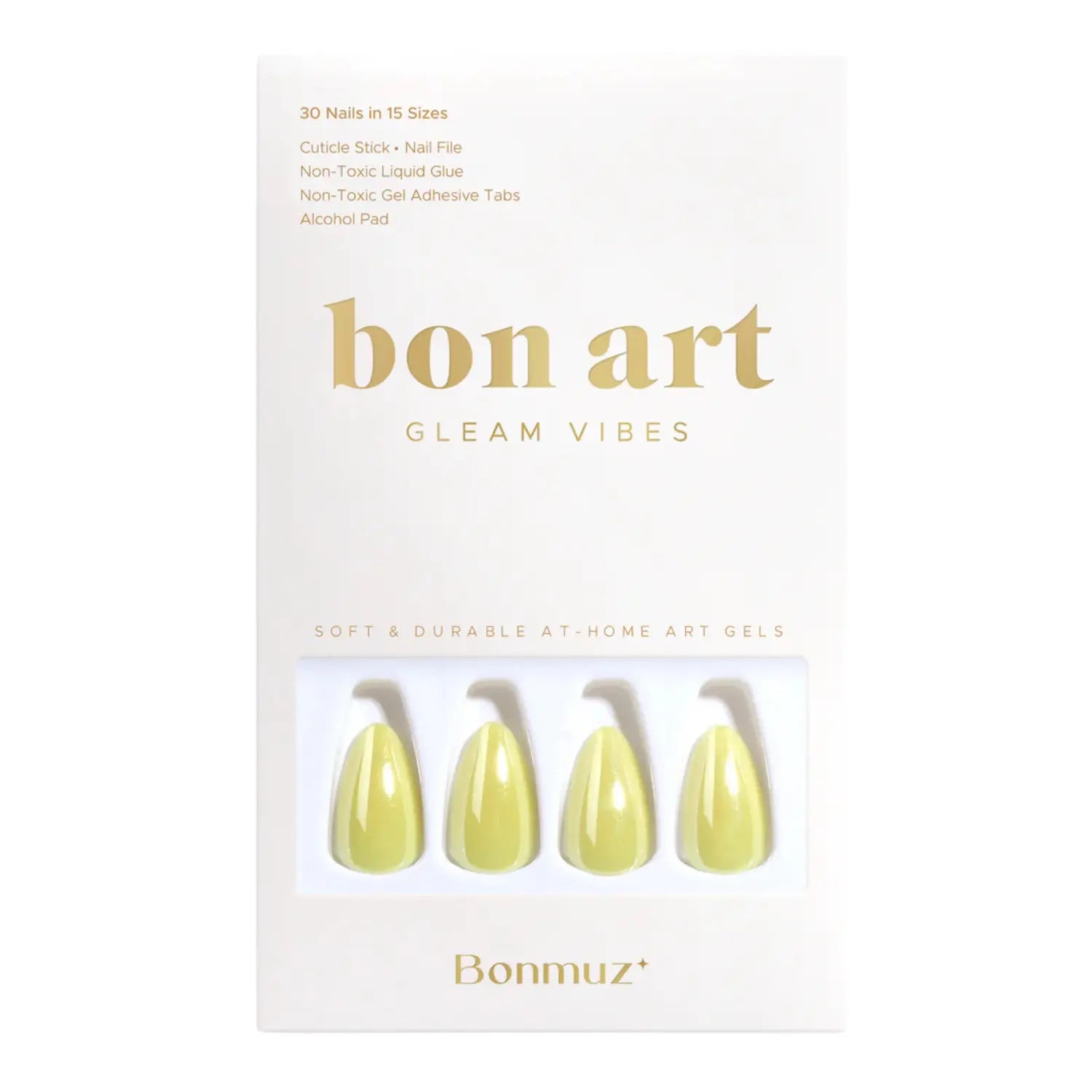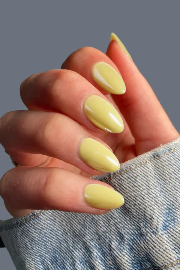 Die Bonmuz Press-On Nails Zesty Pop sind ein frisches, verspieltes Set aus Short Stiletto Press-On Nails in einem herrlichen Lemon Glaze Farbton. Das smooth glazed Finish verleiht jedem Nagel einen High Shine, candyartigen Glow, der sofort für eine fröhliche, sommerliche Vibe sorgt.