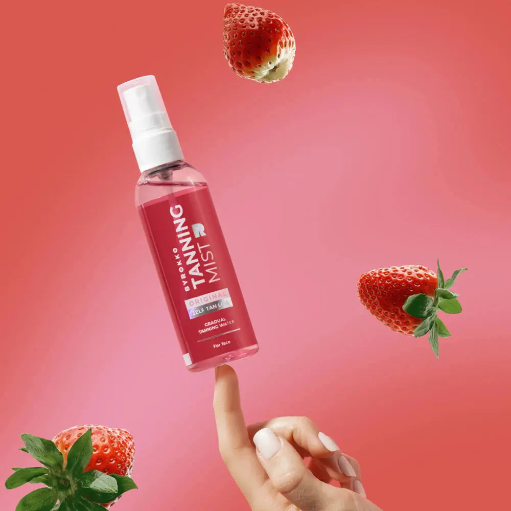 Mit dem Byrokko Strawberry Tanning Mist strahlst du das ganze Jahr über, ganz ohne Sonne oder Solarium. Dieses Selbstbräunungsspray verleiht Gesicht und Körper innerhalb weniger Stunden einen natürlich wirkenden, gleichmäßigen Teint. Ein einziger Sprühstoß genügt und du erhältst einen frischen, urlaubsreifen Glow, perfekt für jeden Anlass, ganz ohne Flecken oder Aufwand.