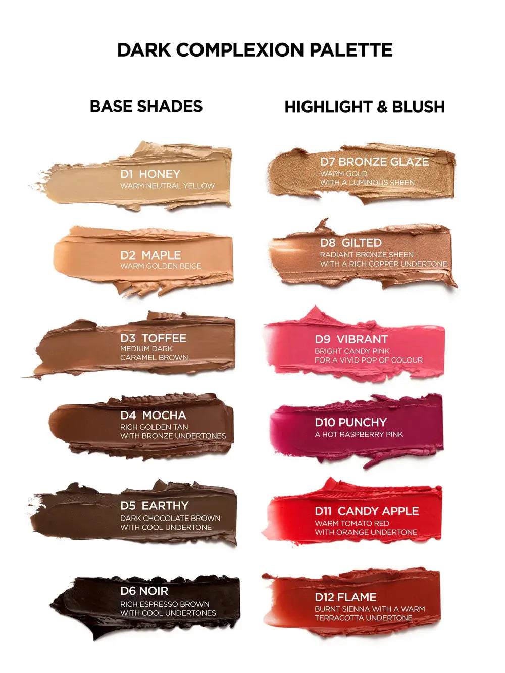 Inhaltsstoffe: Shades D1, D2, D3, D4, D5, D6, D9, D10, D11, D12 – Ethylhexyl Palmitate, Mica, Polyisobutene, Synthetic Wax, Paraffinum Liquidum (Mineral Oil), Paraffin, Silica, Sorbitan Olivate, Sorbitan Sesquioleate, Phenoxyethanol, Caprylyl Glycol, Kann enthalten [+/- CI 77492, CI 77891, CI 77499, CI 77491, CI 15850 (Red 7 Lake), CI 15850 (Red 6 Lake)]. Shade D7 – Ethylhexyl Palmitate, Mica, Synthetic Wax, Polyisobutene, Paraffin, Silica, Synthetic Fluorphlogopite, Sorbitan Olivate, Sorbitan Sesquioleate, Phenoxyethanol, Caprylyl Glycol, Tin Oxide, CI 77891, CI 77491. Shade D8 – Ethylhexyl Palmitate, Mica, Synthetic Wax, Polyisobutene, Paraffin, Silica, Synthetic Fluorphlogopite, Sorbitan Olivate, Sorbitan Sesquioleate, Phenoxyethanol, Caprylyl Glycol, CI 77891, CI 77491, CI 77492, CI 77499.