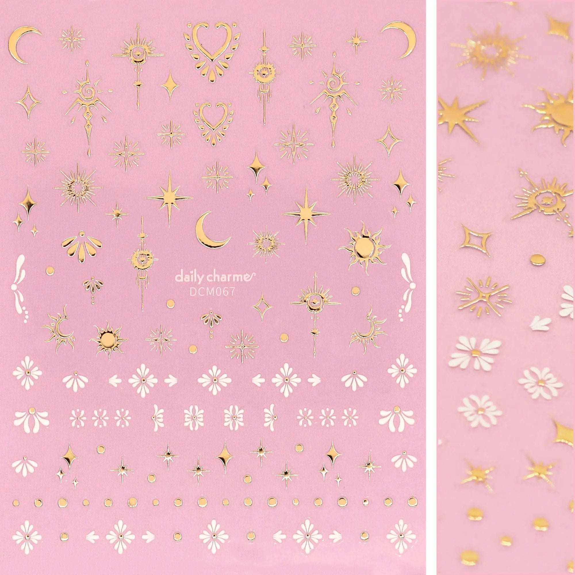 Der Daily Charme 3D Embossed Nail Art Sticker Celestial Element verleiht deinen Nägeln einen magischen Touch mit einer Mischung aus metallisch-goldenen und mattweißen Designs. Dieses Stickerbogen ist vollgepackt mit abstrakten Sonnen, Monden, Sternen, Sparkles, Punkten, Tribal-Elementen und kleinen Blümchen.