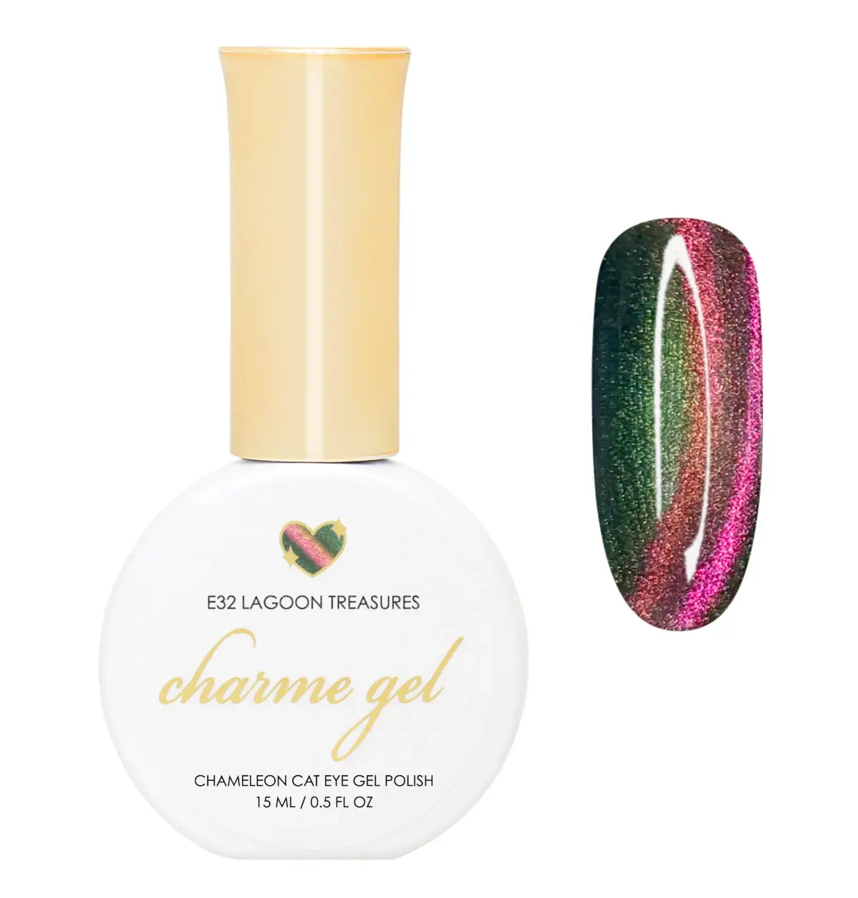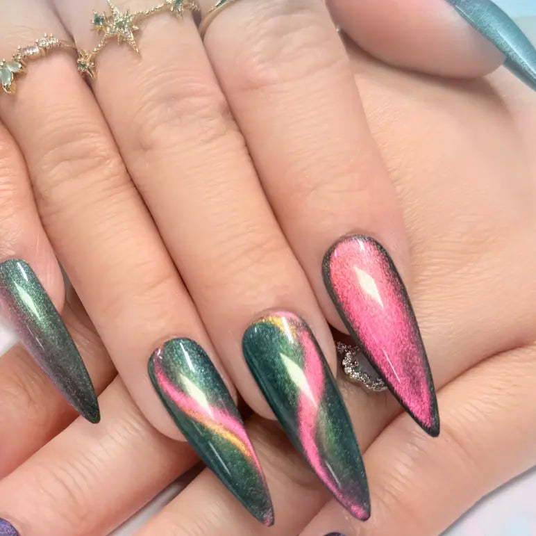 Der Daily Charme Gel Cat Eye E32 Lagoon Treasures ist deine ultimative Sommerstimmung im Tiegel! Dieser frische Grünton wechselt bei jeder Bewegung zu pfirsichrosa und lebhaftem Pink, wie Sonnenstrahlen, die über eine geheime Lagune mit funkelnden Schätzen tanzen.