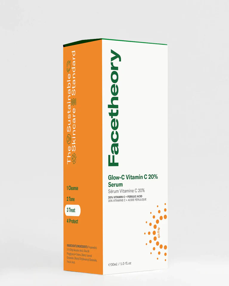 Das Facetheory Glow-C Vitamin C 20% Serum ist ein kraftvoller, aber sanfter Booster für alle, die sichtbare Ergebnisse ohne Hautirritationen wünschen. Dieses Serum enthält 20 % ethyliertes Vitamin C, kombiniert mit Ferulasäure und feuchtigkeitsspendendem Glycerin. Gemeinsam sorgen sie für einen gleichmäßigen, strahlenden Teint mit verbesserter Elastizität und weniger sichtbaren dunklen Flecken.