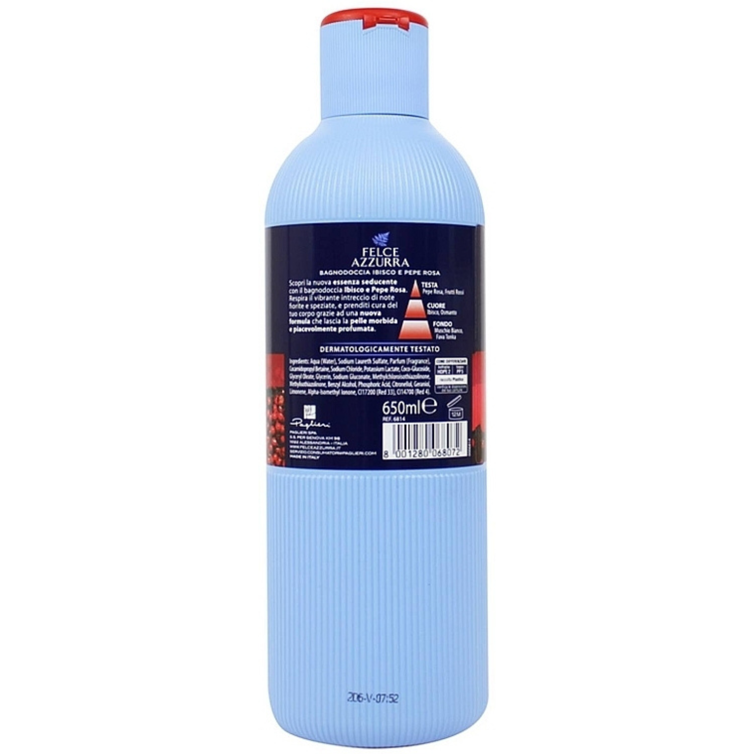 Das Felce Azzurra Shower Gel Sakura Flowers 650 ml nimmt dich mit auf eine sinnliche Reise voller tiefer Rottöne, samtiger Hibiskusblütenblätter und einem würzigen Hauch von rosa Pfeffer. Dieses luxuriöse Duschgel eröffnet mit spritzigen Kopfnoten aus Ingwer und roten Früchten, die in ein verführerisches blumiges Herz aus Hibiskus, Osmanthus und Maiglöckchen übergehen.