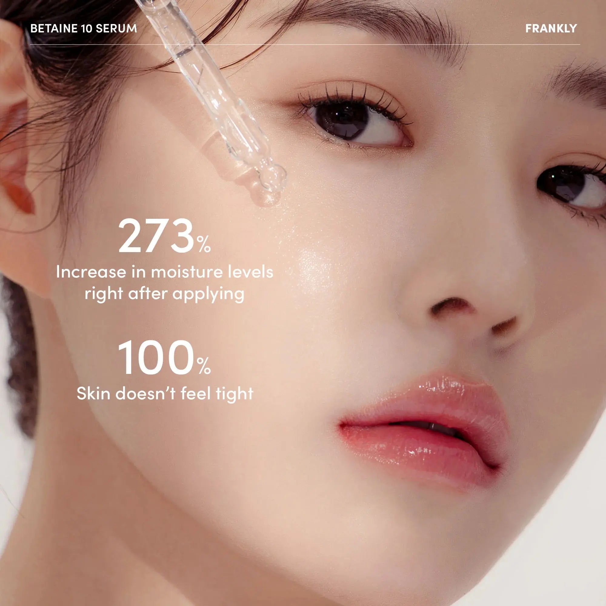 Das FRANKLY Betaine 10 Serum ist ein sanfter, aber wirksamer Pflege-Boost für alle mit empfindlicher oder trockener Haut, die etwas zusätzliche Liebe gebrauchen kann. Mit 10% Betaine und 1% Niacinamid beruhigt, glättet und hellt dieses hypoallergene Serum die Haut auf: ganz ohne Irritation. Ideal bei rauer Hautstruktur, Trockenheitsfältchen oder einem fahlen Teint.