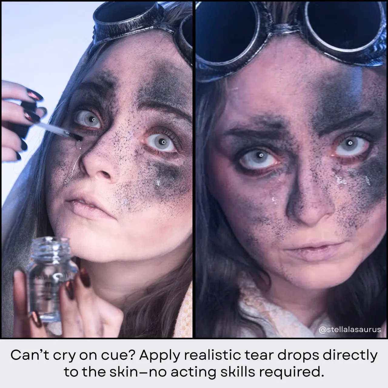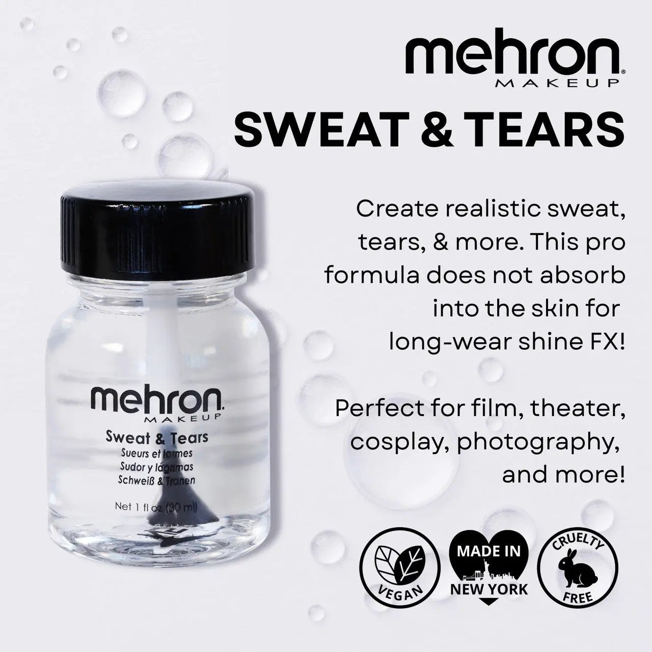 Trage es ganz einfach mit dem Pinsel oder Schwämmchen tupfend auf, um feine Feuchtigkeitsperlen zu erzeugen. Du willst mehr Dramatik? Dann trage es in mehreren Schichten auf für größere Tropfen. Ein kleiner Tropfen im Augenwinkel sorgt sofort für einen überzeugenden Träneneffekt. Ein Must-have für SFX Artists, Performer und alle, die ihrem Look ein wenig zusätzliches Drama verleihen möchten.