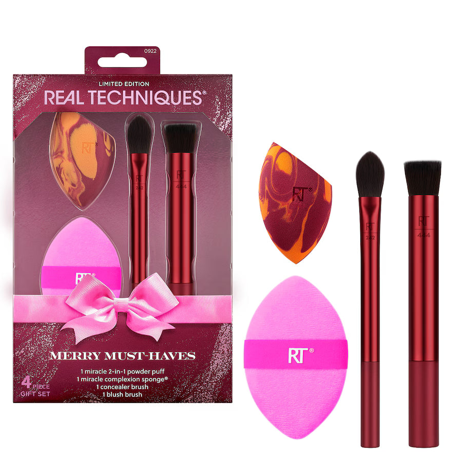 Die Real Techniques Merry Must-Haves ist das 4-teilige Set, von dem TikTok-Beauty-Liebhaber träumen! Diese Kombination aus Schwämmen und Pinseln enthält alles, was du brauchst, um den viralen Cold-Girl-Look zu kreieren: ein frischer Blush, sanfter Glow und geblurrte, makellose Haut. Und das mit nur wenigen Tools? Yes please!