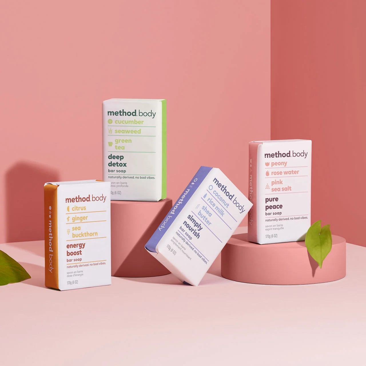 Die Method Body Pure Peace Bar Soap ist dein kleiner Ruhepol in einem hektischen Alltag. Diese Bar Soap reinigt die Haut sanft und hüllt dich in den verträumten Pure Peace-Duft mit zarten Noten von rose water, peonies und einem Hauch sea salt.