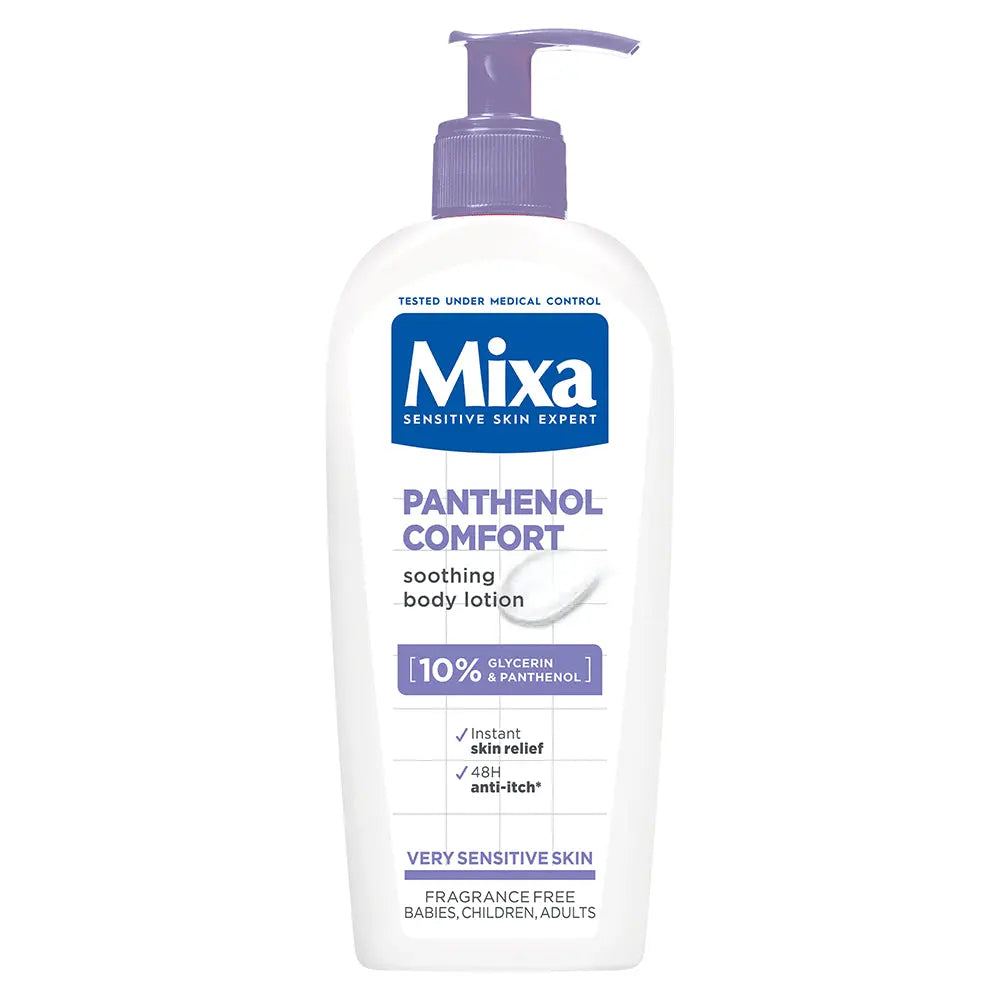 Die Mixa Panthenol Comfort Body Lotion ist eine beruhigende Bodylotion für trockene und ekzemanfällige Haut, die häufig unter Juckreiz leidet. Die Formel mit 10% Glycerin und Panthenol hilft, Trockenheit zu reduzieren und lässt die Haut sofort angenehmer anfühlen, während Glycerin intensiv Feuchtigkeit spendet und Panthenol die Haut beruhigt und bei der Regeneration unterstützt.