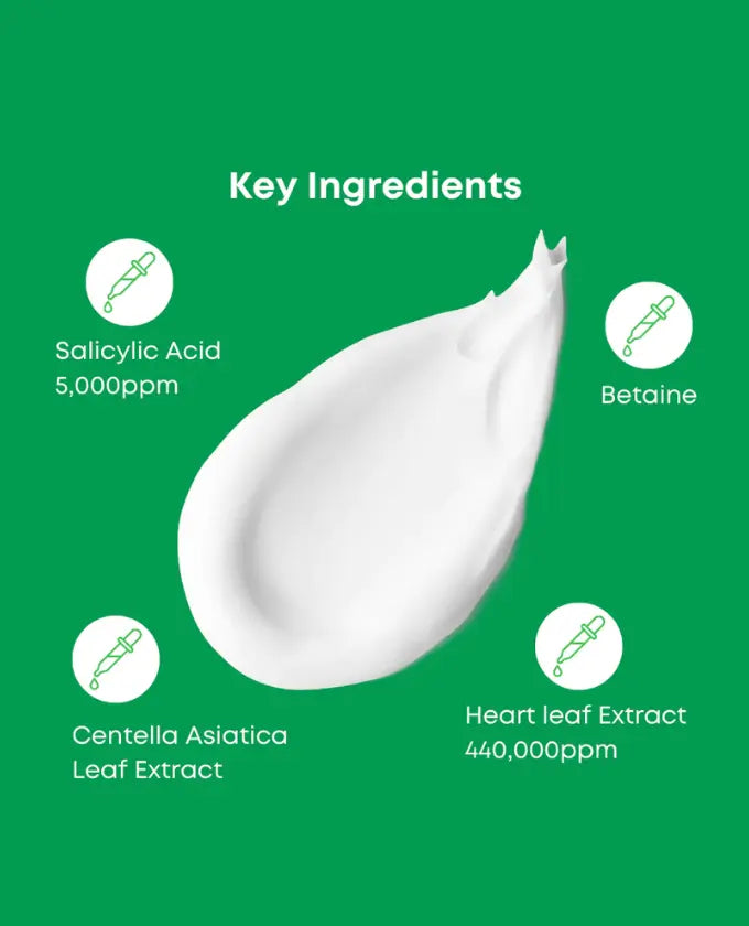 Houttuynia Cordata Extract (440,000 ppm), Glycerin, Myristic Acid, Water, Lauric Acid, Palmitic Acid, Stearic Acid, Potassium Hydroxide, Glyceryl Stearate, Decyl Glucoside, Cocamidopropyl Betaine, Sorbitan Olivate, 1,2-Hexanediol, Salicylic Acid (5,000 ppm), Dipropylene Glycol, Lauramide DEA, Hydroxyacetophenone, Sodium Chloride, Caprylyl Glycol, Betaine, Capric Acid, Salix Alba (Willow) Bark Extract, Cladosiphon Okamuranus Extract, Centella Asiatica Leaf Extract, Camellia Sinensis Leaf Extract, Disodium EDTA, Arachidic Acid, Coffea Arabica (Coffee) Seed Extract, Citrus Aurantium Bergamia (Bergamot) Leaf Extract, Pinus Densiflora Leaf Extract, Dipotassium Glycyrrhizate.