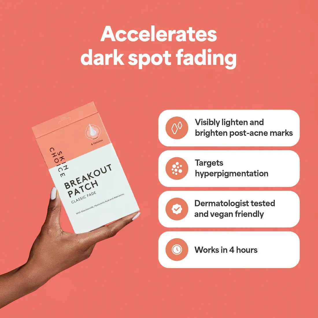 Der Skin Choice Breakout Patch Classic Fade wurde speziell entwickelt um dunkle Flecken und Aknenarben sichtbar zu reduzieren. Dieser gezielte Patch verschmilzt innerhalb weniger Stunden mit der Haut und bringt hochwirksame Inhaltsstoffe tief unter die Hautoberfläche. Ideal zur Behandlung von Hyperpigmentierung nach Unreinheiten und zur Wiederherstellung eines ebenmäßigen strahlenden Teints.