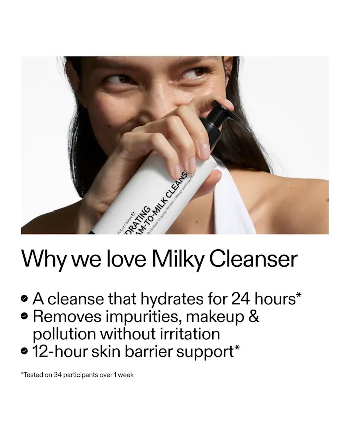Hydrating Cream-To-Milk Cleanser 50 ml: Aqua (Water), Glycerin, Ethylhexyl Palmitate, C12-15 Alkyl Benzoate, PEG-6 Caprylic/Capric Glycerides, Betaine, Polyglyceryl-3 Dicitrate/Stearate, Sodium Acrylate/Sodium Acryloyldimethyl Taurate Copolymer, Isohexadecane, Pentylene Glycol, Propanediol, Butyrospermum Parkii (Shea) Butter, Hydroxyacetophenone, Oryza Sativa (Rice Starch), Caprylyl Glycol, Cetearyl Olivate, Polysorbate 80, Sorbitan Olivate, Ethylhexylglycerin, Sodium Hydroxide, Sorbitan Oleate, Xanthan Gum, Hydrolyzed Rice Protein, Oryza Sativa (Rice) Bran Oil, Inulin, Polyquaternium-10, Hydrolyzed Sodium Hyaluronate, Sodium Hyaluronate, Phenoxyethanol, Lecithin.