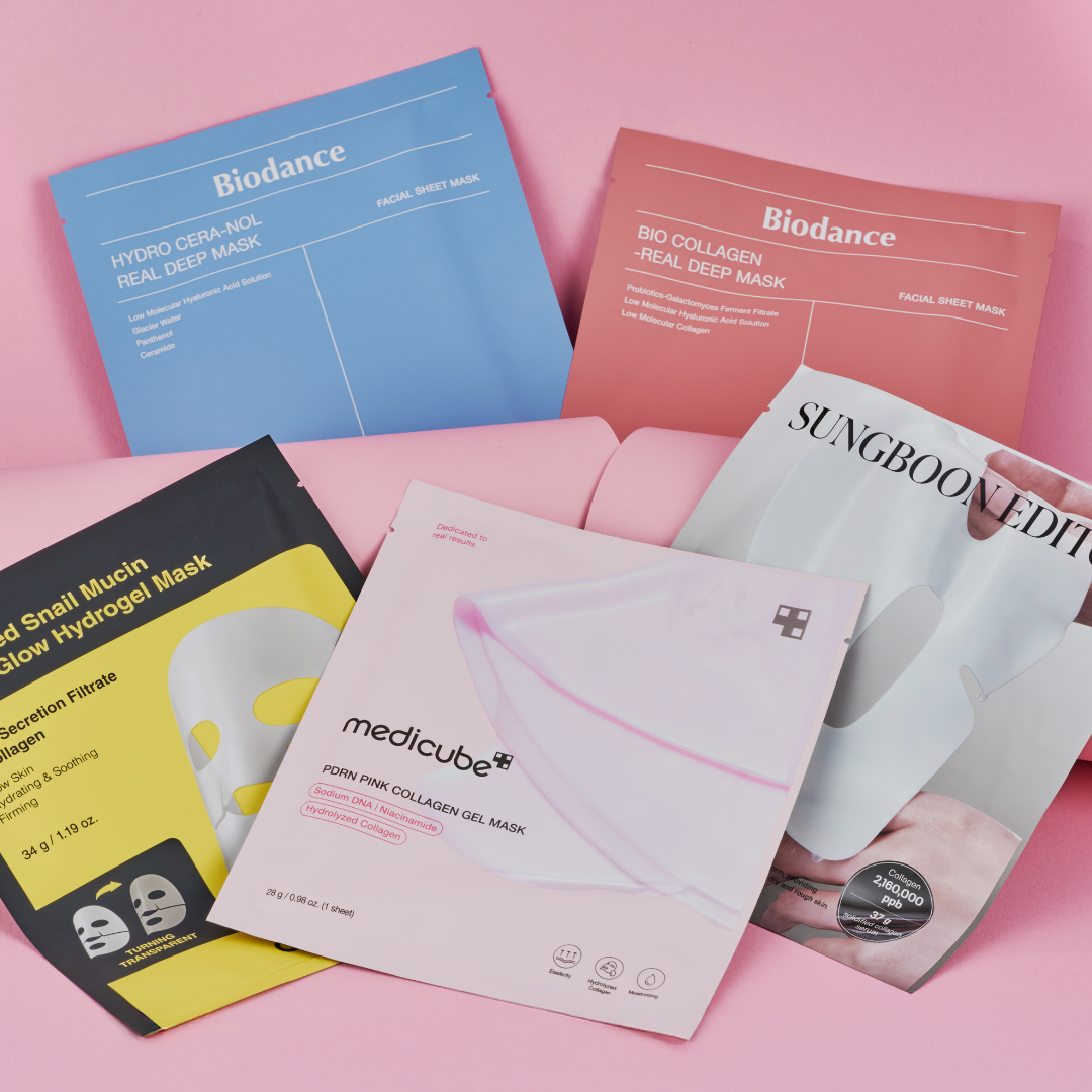 Inhalt: Biodance Bio-Collagen Real Deep Mask, Biodance Hydro Cera-nol Real Deep Mask, COSRX Advanced Snail Mucin Glass Glow Hydrogel Mask 1 pc*, Medicube PDRN Pink Collagen Gel Mask und Sungboon Editor Deep Collagen Power Boosting Mask.