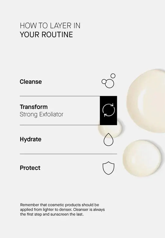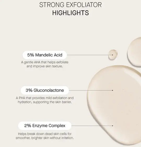 Die Formel enthält 5 % Mandelsäure (AHA), um die Hauttextur zu verfeinern, feine Linien zu glätten und Unreinheiten zu reduzieren. 3 % Gluconolacton (PHA) sorgen für sanftes Resurfacing, spenden Feuchtigkeit und stärken die Hautbarriere. Und das 2 % Enzymkomplex? Entfernt abgestorbene Hautzellen ganz ohne Rubbeln. Ideal für alle, die Ergebnisse lieben – aber ihre Haut respektieren wollen. Hinweis: Nicht geeignet für sehr empfindliche Haut!