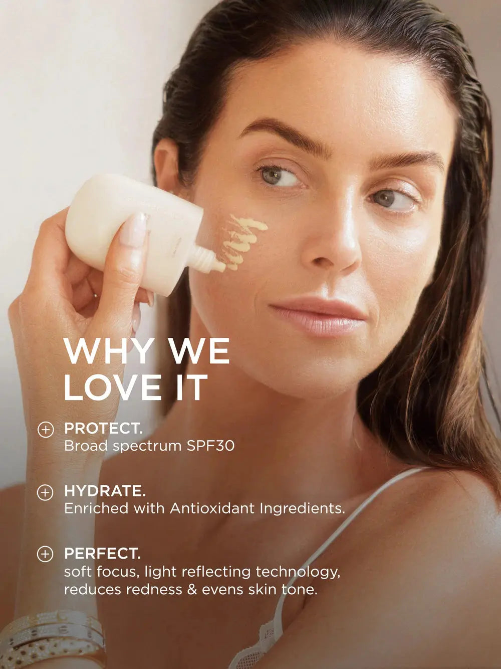 Mit SPF30 schützt diese Base deine Haut vor schädlicher Sonneneinstrahlung, während Antioxidantien helfen, die Haut zu beruhigen und zu stärken. Rötungen werden sichtbar reduziert, der Teint wirkt gleichmäßiger und du erhältst das dewy Finish, das wir uns alle wünschen. Sag tschüss zu fahler Haut und hallo zu frischem Glow.