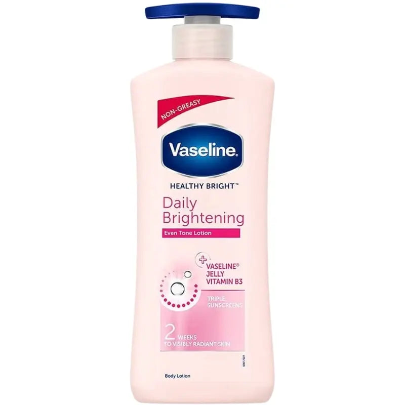 Die Vaseline Body Lotion Daily Brightening 600 ml ist eine pflegende Bodylotion, die der Haut hilft, ihren natürlichen Glanz zurückzugewinnen. Die leichte, schnell einziehende Formel spendet intensive Feuchtigkeit und sorgt innerhalb von zwei Wochen für sichtbar strahlendere und gesündere Haut. Mit Mikrotropfen aus Vaseline® Jelly unterstützt diese Lotion die Regeneration der Haut durch langanhaltende Feuchtigkeitsversorgung, trockene Stellen verschwinden und die Haut fühlt sich weich und geschmeidig an.