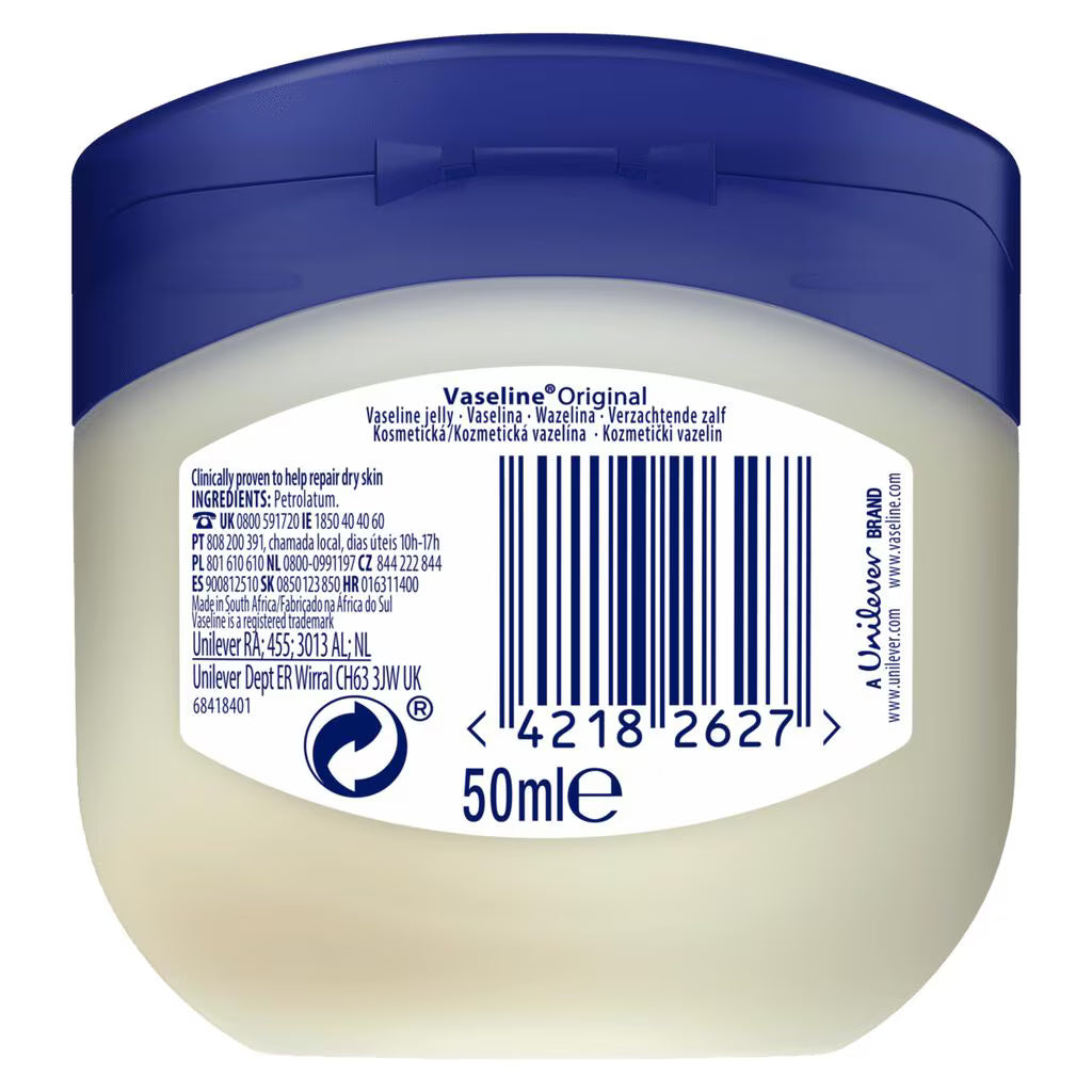Die Vaseline Pure Petroleum Jelly Original 50 ml ist ein echter Klassiker in der Hautpflege: und das seit über 150 Jahren! Dieses reichhaltige, pflegende Jelly ist die Lösung bei trockener, rauer oder gereizter Haut und wirkt wie eine schützende Schicht, die Feuchtigkeit einschließt und die Haut bei der Regeneration unterstützt.