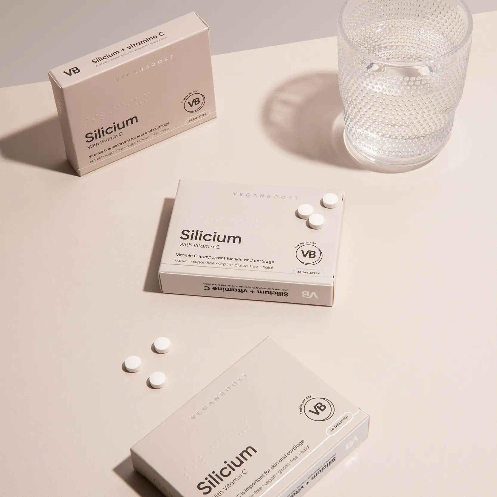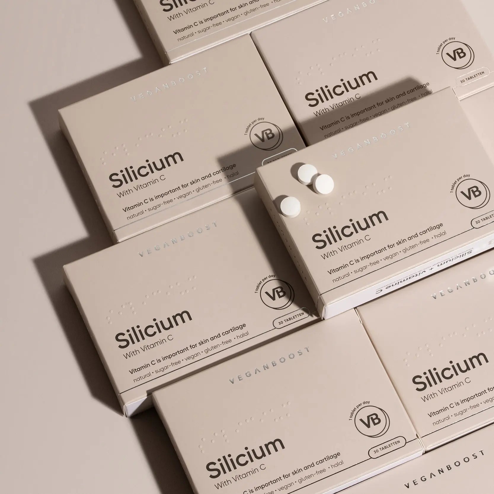 Die Veganboost Silicon Tablets sind dein täglicher Beauty Boost von innen. Diese Nahrungsergänzungsmittel enthalten eine kraftvolle Kombination aus Silicium und Vitamin C und wurden speziell entwickelt, um Haut, Knorpel und Knochen auf natürliche Weise zu unterstützen. Einfach einzunehmen und perfekt geeignet, um deiner täglichen Routine einen gesunden und strahlenden Look zu verleihen.