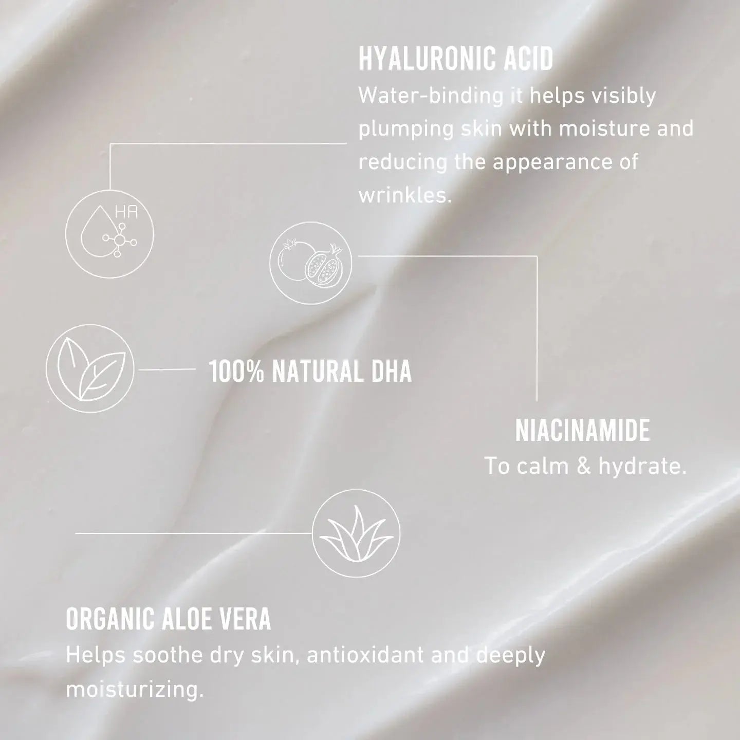 Aqua (Water), Glycerin, Niacinamide, Dihydroxyacetone, Cetearyl Alcohol, Cetyl Alcohol, Ceteareth-20, Glyceryl Stearate, Saccharide Isomerate, Butyrospermum Parkii (Shea) Butter, Aloe Barbadensis (Aloe Vera) Leaf Juice Powder, Sclerocarya Birrea (Marula) Seed Oil, Glycyrrhiza Glabra (Licorice) Root Extract, Rubus Idaeus (Raspberry) Leaf Extract, Punica Granatum (Pomegranate) Juice Extract, Ginkgo Biloba (Gingko) Leaf Extract, Cucumis Sativus (Cucumber) Fruit Extract, Hamamelis Virginiana (Witchhazel) Leaf Extract, Fucus Vesiculosus (Bladderwrack) Extract, Carica Papaya (Papaya) Fruit Extract, Vitis Vinifera (Grape) Fruit Extract, Cucumis Melo (Melon) Fruit Extract, Tocopheryl Acetate, Hyaluronic Acid, Hydrolyzed Silk, Sodium Citrate, Panthenol, Dimethicone, Phenoxyethanol, Ethylhexylglycerin, Disodium EDTA, Citric Acid, Sodium Benzoate, Potassium Sorbate.